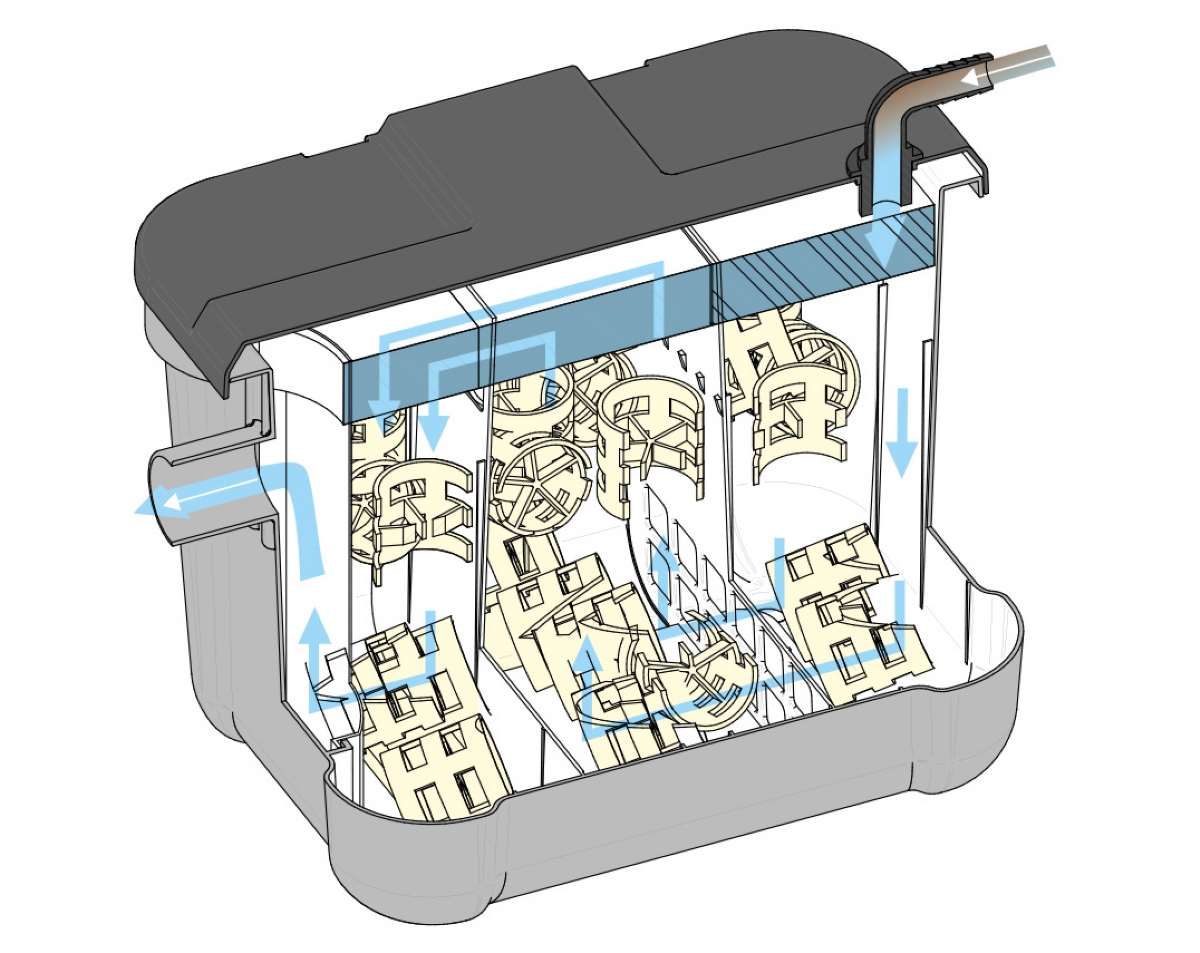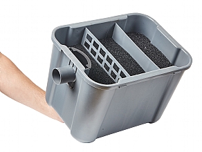 Průtoková sada je určena pro jezírka do objemu 8 m3 bez ryb a 4 m3 s rybami. Jedná se o průtokovou filtraci s vysokým biologickým dosahem, čerpadlo jednoduše umístíte do jezírka a propojíte s filtrační nádobou umístěnou u břehu jezírka. Umístěte čerpadlo na opačnou stranu od filtračního systému, tak aby docházelo k přirozené cirkulaci vody. Čerpadlo je osazeno UV lampou o výkonu 9 W pro ti řasám a s velkou nasávací plochou, dále lavagranulátem a filtrační houbou pro usazování filtračních bakterií (funguje jako předfiltr). Předčištěná voda se pak dopravuje do filtrace, která je osazena filtračními materiály pro uchycení filtračních bakterií (domečky, filtrační houba), zde dochází k mechanickému a biologickému čištění. Díky tříkomorovému systému se dostaví lepší výsledek filtrování. Po přefiltrování jde výpustí zpátky do jezírka.