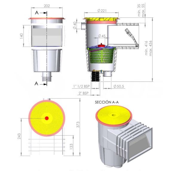 Skimmery Astral jsou vyrobeny z ABS plastu a jejich vnější části jsou stabilizovány proti UV záření. Doporučený průtok je 5 - 9 m3/h.