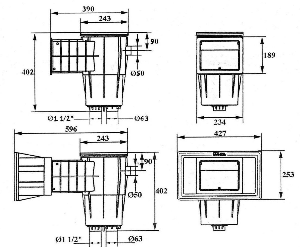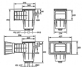 Skimmery KRIPSOL do betonu nebo fólie jsou vyrobeny z bílého vstřikovaného ABS. Kulaté víko upevněné na čtvercový rám. Dvířka sání se závěsy upevněny pomocí snadno vyměnitelných osiček z ABS.