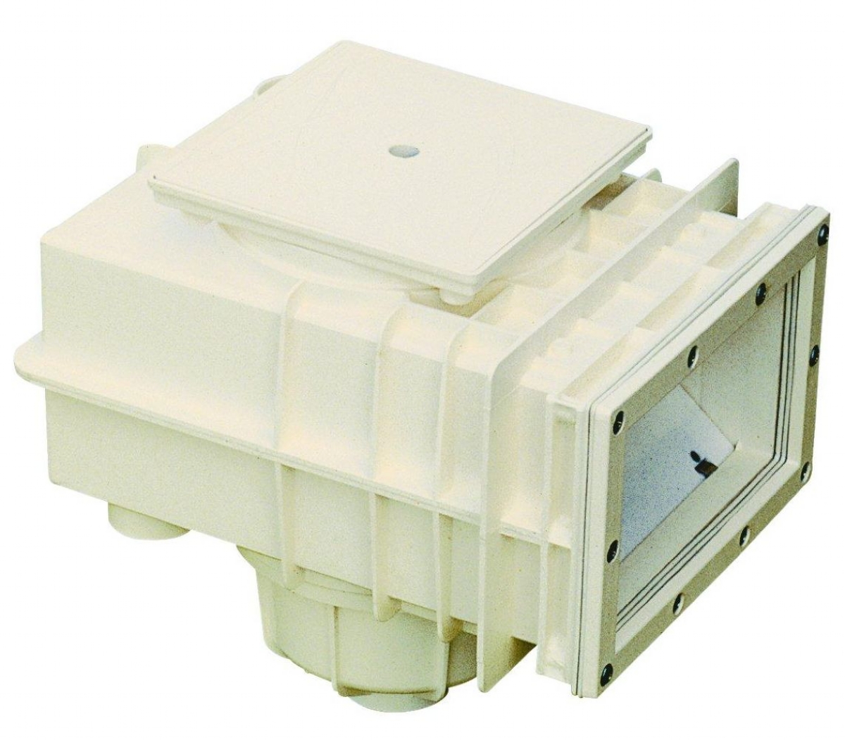 Malý skimmer značky MTS s kapacitou "širokého skimmeru", úprava výšky hladiny, 32 mm přepad, mosazné zástřiky 10x M6, napojení lepením o průměru 50 nebo 63 mm.
