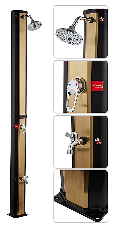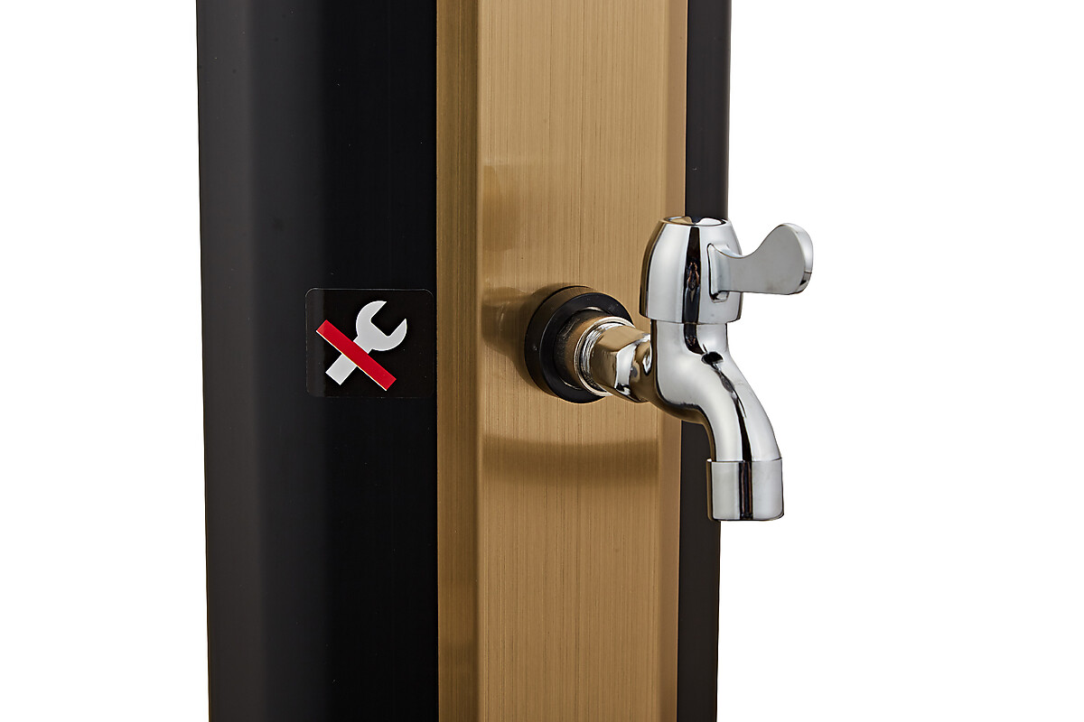 Solární sprcha NEOVA Korfu 35L v černo-zlatém provedení je perfektním doplňkem každé zahrady, terasy nebo okolí bazénu. Díky svému modernímu designu a ekologickému fungování bez potřeby elektřiny nabízí komfortní osvěžení a šetří náklady na energii. Tato sprcha využívá solární energii k ohřevu vody až na 60°C, což je ideální pro letní dny, kdy chcete mít k dispozici teplou vodu bez jakéhokoli zásahu do elektrické sítě.