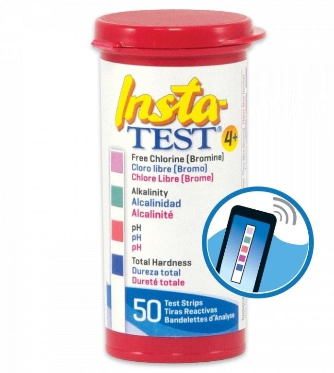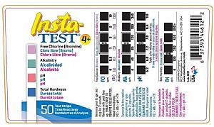 Proužky pro bazény a lázně měří volný chlór 0-10 ppm, brom 0-20 ppm, celkovou alkalitu 0-240 ppm, pH 6,2-9,0 a celkovou tvrdost 0-800 ppm. Tyto testovací proužky poskytují okamžité výsledky. Balení obsahuje 50 testovacích proužků balených ve voděodolné PopTop lahvičce s odklápěcím uzávěrem.