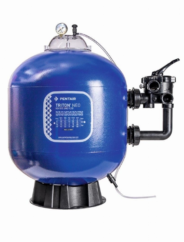 Filtry TRITON NEO-C-PRO TR jsou vyrobeny ze sklolaminátu, jsou bezešvé, zesílené vrstvou polyesteru, vybaveny 6-ti cestným bočním ventilem s manometrem, umístěny na podstavci.