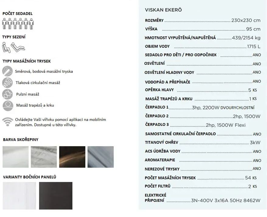 Nejvyšší modely (Ekerö, Lindö) jsou dokonce vybaveny Flexi čerpadlem, které nabízí 3 rychlosti, tedy další možnost optimálního nastavení vysněné masáže. V-Serie dále disponuje prémiovým balíčkem osvětlení, aromaterapií a nejlepším čistícím systémem na trhu - AOP. Perličkou na V-Serii je titanový ohřívač, který maximalizuje životnost Vaší vířivky.