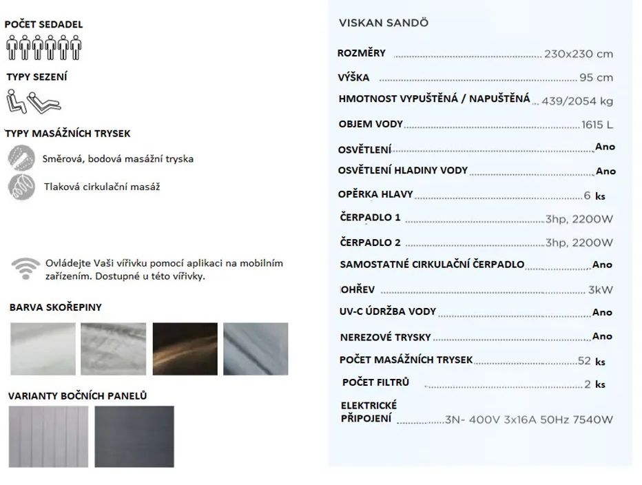 Sandö je bezesporu vířivka, která představuje prémiovou kvalitu za rozumnou cenu. Měří 230 x 230 cm a disponuje hlubokými pozicemi, které jsou pro Viskan typické.