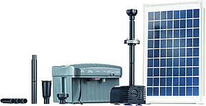 Solární čerpadlová sada nabízí díky hybridnímu designu maximální výkon při minimální spotřebě energie. Součástí je velký solární panel, baterie, LED kroužek, 2 nástavce na vodní prvky, akumulátor 7 Ah a automatické ovládání. Čerpadlo lze použít i jako čistě solární čerpadlo. LED osvětlení včetně baterie, které je součástí setu, se automaticky zapíná ve tmě a vytváří skvělé světelné efekty v zahradním jezírku.