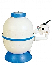 Monolitický filtr s horním šesticestným ventilem a podstavcem. Manometr, odvzdušňovací zátka, vypouštění vody. Pro bazén do 40 m3.