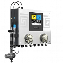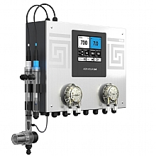 Výkonný elektrolyzér s modulem pro řízení pumpy s variabilním výkonem, s měřením pH a redox potenciálu a integrovanými dávkovacími čerpadly pro regulaci pH a dezinfekce a dávkování algicidu.