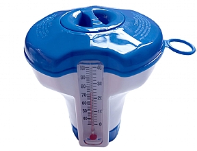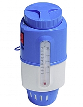 Plovoucí dávkovač na 20g tablety s teploměrem. Vhodný pro malé bazény a vířivky.Výška 118 mm, průměr 110 mm.