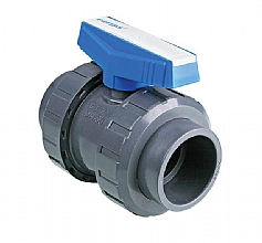 PVC kulový dvoucestný ventil. Varianty pro potrubí 16 x 3/8’’ - 110 x 4’’. Připojení - závit.
